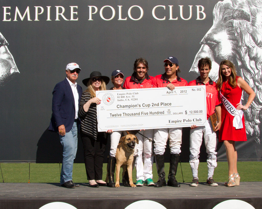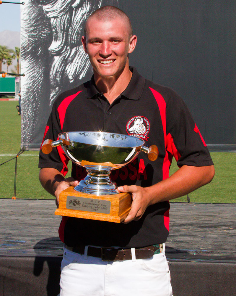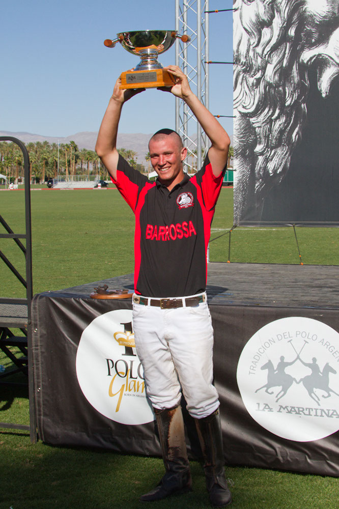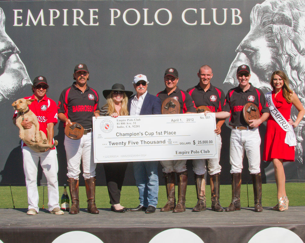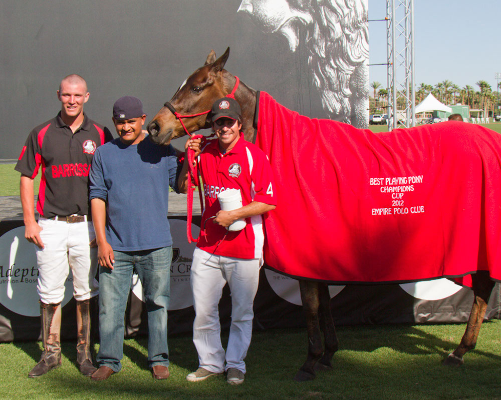 Jesse Bray, substituting for an injured Ernie Ezcurra, scored ten goals as Barrossa (Erik Wright, Jef Graham, Santiago Trotz and Jesse Bray) smothered Trinity (Rick Paicius, Robin Paicius, Clemente Zavaleta and Agustin Zavaleta) in the finals of the 2012 Champions Cup finals at the Empire Polo Club in Indio, California Sunday afternoon.
