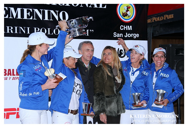 The PoloGlam trophy – especially designed by Miss Pistarini – was a sterling silver cup including real stones of diamonds and emeralds. The trophy will be played for world-wide under the guidance of Pistarini and Sunny Hale, founder of the Womens Championship Tournament (WCT) series. As tradition at Palermo, both teams were presented to the spectators by the Chairman of the San Jorge Polo Club, Sr. Jorge Apa and given trophies by PoloGlam and Claudia Pistarini. Miss Hale had the opportunity to thank the hosts in Spanish which certainly was enjoyed and appreciated by all.