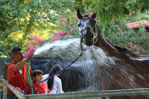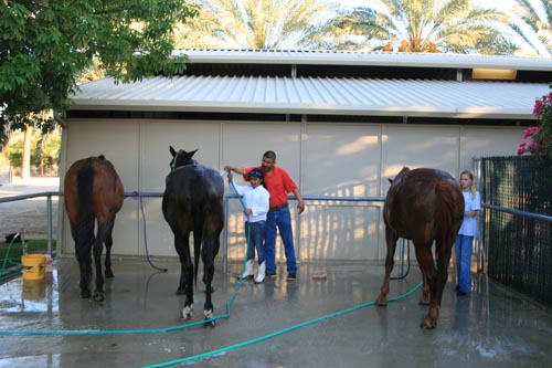 In early July, six young polo players drove into Empire Polo Club to be welcomed to Empire’s first Summer Day Camp Program. The program was developed to promote the sport of polo to local residents and junior riders. The camp was hosted by Empire Polo Club. They provided a 12- stall barn, tack room, arena and grass playing fields, plus a continuous supply of ice and cold water for our players, parents and instructors. The barn was uniquely decorated with Independence Day American flags in recognition of the holiday weekend.