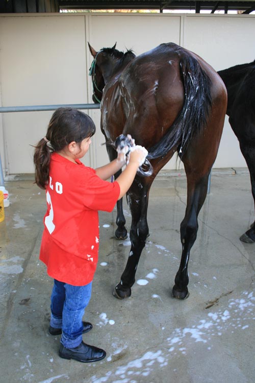 Our first session focused on grooming techniques for a polo horse. Primo, Al Haagen’s polo groom, demonstrated to the players how to properly bathe a horse, clean out the hooves of the horse and roach the mane and tails of the horses. Each player then proceeded to use Primo’s techniques on their own horses. When the evening ended we tried to judge who had the prettiest polo pony, but they all looked equally good.
