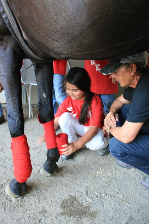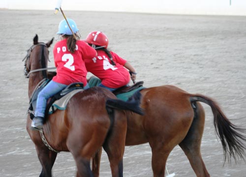 Friday’s lessons focused on tack maintenance and identifying and naming polo bits and bridle parts. They learned to wrap a horse’s legs with polo wraps and to tie their horse’s tail. They made bets during the practice game on who‘s tail will stay up the longest. The evening culminated in a “Groom’s Race” between the two teams. There was a lot of cheering and excitement on each side. The race was so close that one could say it was a draw. The players did a great job of putting their grooming knowledge to the test.