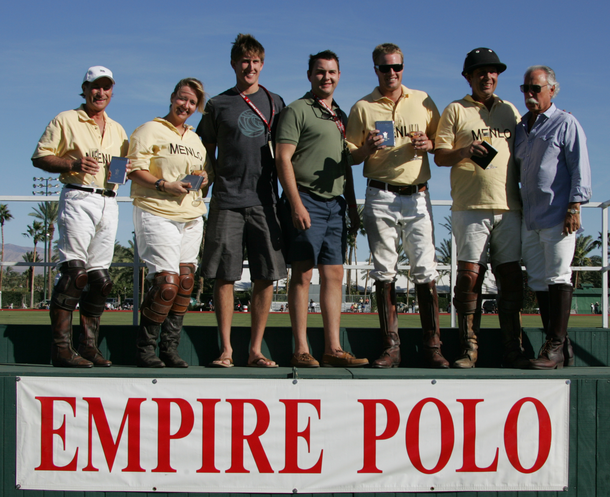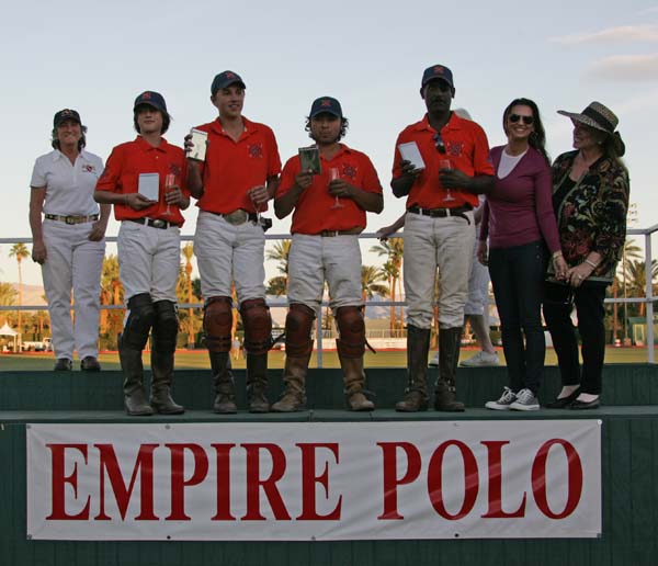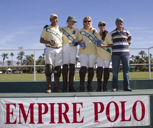 Eighty three players, including eight junior polo players, cantered over the red boards and onto healthy fields for two days of complimentary, competitive polo in three brackets. Rancho Amistad’s Santos Arreola, Susie Anthony, Kate Ewart and Karin McCoy took the trophy in Bracket 3 on a 6-2 win over AJ’s team of Antonio Juarez, Rob Gallagher, Kit Neacy and Susan Cooley/Carol Hemker splitting. In Bracket 2, Casa Lago’s Domingo Questel, Alexander Barojas, Zander Deutsch and Jacob Deutsch defeated Team Maximus 7-5, of Jared Sheldon, Andy Arnold, Chip McKinney and Ray Rosario. In the four-goal Bracket 1, Parklane’s Bill Garlock, Ashton Wolf, Kendra Clark and Brad Ramsby rolled over Urban Dog’s Rob Yackley, Grainger Hines, Antonio Juarez and Kim Garsed 9-7.