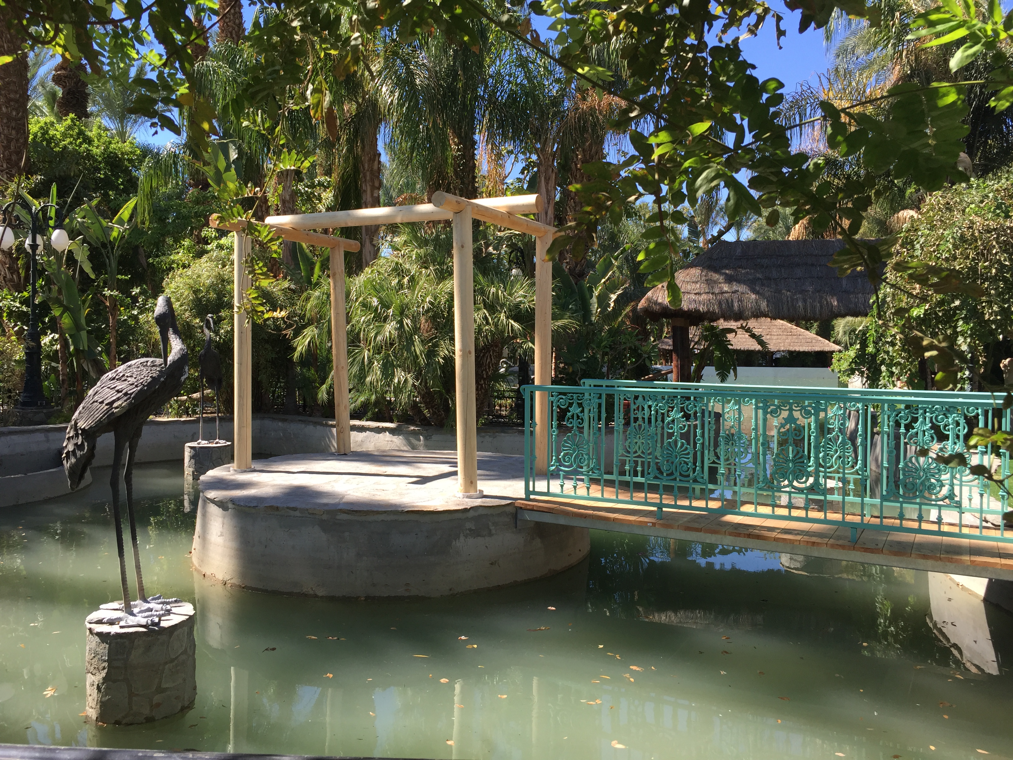 A rustic gazebo island and bridge have been added to Medjhool Lake.